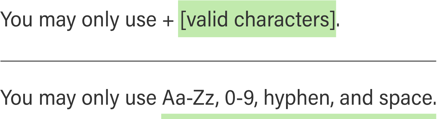 Display valid characters when possible. This example also conveys the accepted letters case to the users.